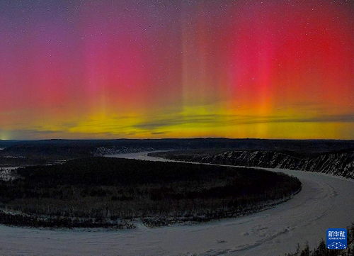 這是3月22日在黑龍江省大興安嶺地區(qū)圖強林業(yè)局龍江第一灣景區(qū)拍攝的絢麗極光。新華社發(fā)