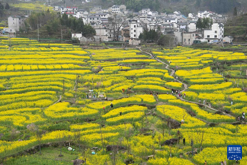 眼下,安徽省宣城市績(jī)溪縣家朋鄉(xiāng)幸福村的油菜花田進(jìn)入盛花期,大批游客來此踏青賞花。