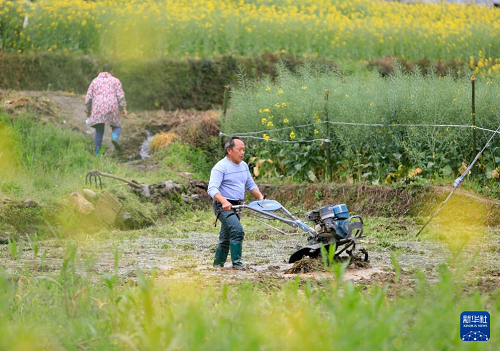 3月24日,在重慶市秀山土家族苗族自治縣溶溪鎮(zhèn)柳水村,村民操作小型機械在田間犁地。(新華社發(fā) 胡程 攝)