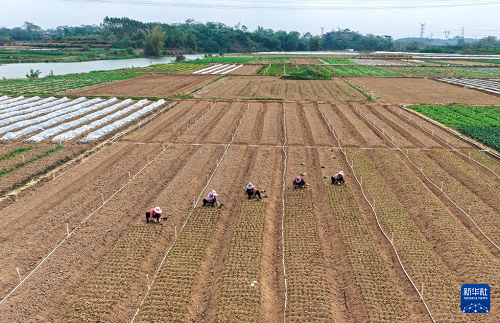 3月24日,廣西南寧市邕寧區(qū)蒲廟鎮(zhèn)農(nóng)民在田園里種植蔬菜(無人機照片)。(新華社發(fā) 方永濤 攝)