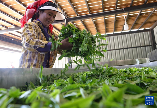 3月28日,云南省勐??h勐混鎮(zhèn)賀開村茶農攤開晾干茶葉鮮葉。(新華社發(fā) 李云生 攝)