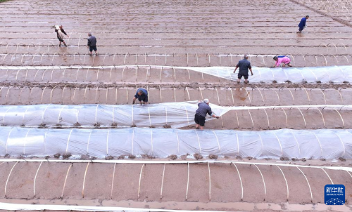 3月31日,村民在四川省眉山市仁壽縣板橋鎮(zhèn)青龍社區(qū)進行水稻集中育秧(無人機照片)。(新華社發(fā) 潘建勇 攝)
