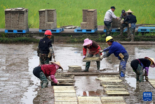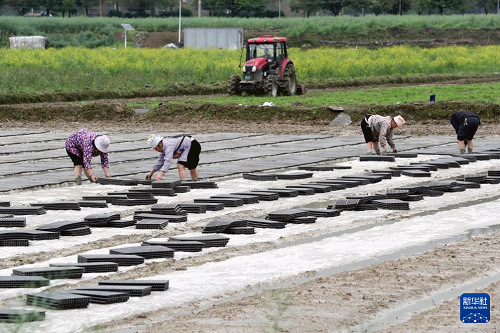 3月29日,農民在浙江省樂清市城東街道一處集中育秧點轉運水稻育秧盤。(新華社發(fā) 蔡寬元 攝)