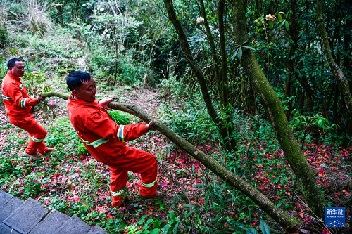 在貴州百里杜鵑管理區(qū)金坡景區(qū),森林防火隊(duì)員們?cè)谘策壨局星謇硪豢玫狗亩霹N樹(4月2日攝)。(新華社記者 楊文斌 攝)
