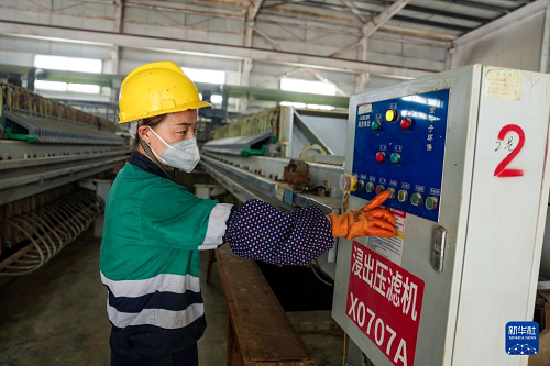 4月13日,在金昌神泥科技有限公司浸出車間,工作人員操作壓濾機進行壓濾作業(yè)。(新華社記者 郎兵兵 攝)