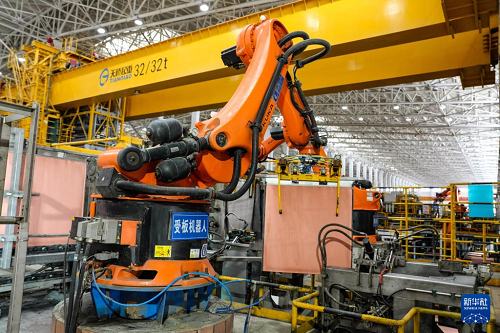 4月14日,在金川集團永昌銅業(yè)有限公司精煉分廠,受板機器人在進行剝片作業(yè)。(新華社記者 郎兵兵 攝)