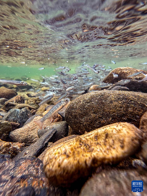 4月15日,魚苗被放流入江(手機(jī)照片)。(新華社記者 顏麟蘊(yùn) 攝)