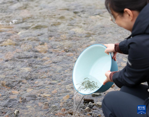 4月15日,志愿者將分裝好的魚苗放入江水中。(新華社記者 顏麟蘊(yùn) 攝)