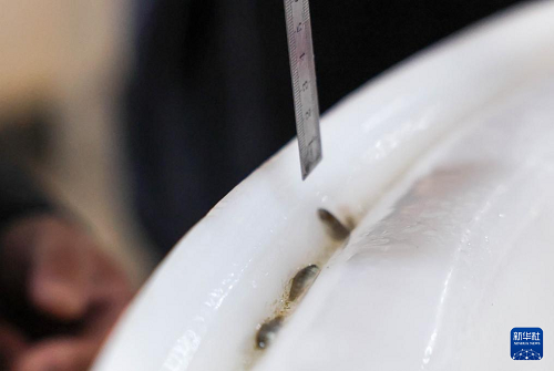 4月15日,工作人員在吉林延邊馬蘇大麻哈良種場(chǎng)繁育車間對(duì)魚苗進(jìn)行檢測(cè)、計(jì)數(shù)。(新華社記者 顏麟蘊(yùn) 攝)