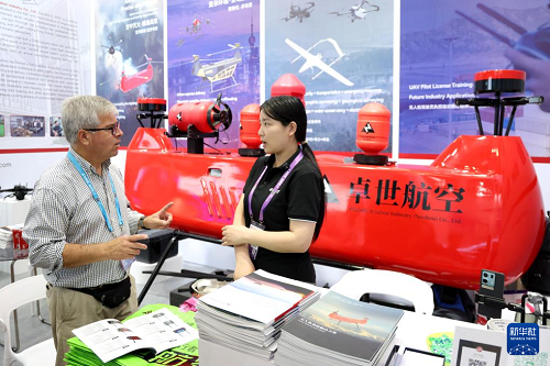 4月15日,外商在廣交會(huì)現(xiàn)場(chǎng)咨詢(xún)了解消防無(wú)人機(jī)。(新華社記者 盧漢欣 攝)