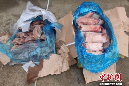 1月25日8時許,支隊(duì)瀾滄邊境檢查站執(zhí)勤官兵查獲3輛可疑貨車,當(dāng)場從車廂內(nèi)查獲用麻布袋遮蓋的冰凍雞腳、豬腳等走私凍品105噸。1月27日19時30分,普洱邊防支隊(duì)支隊(duì)黃莊查緝點(diǎn)在323國道某段開展公開查緝,查獲2輛由景洪駛往昆明的貨車,發(fā)現(xiàn)車內(nèi)拉載的冰凍鴨掌等凍品外包裝均是英文標(biāo)識,且沒有任何檢驗(yàn)檢疫及運(yùn)輸銷售等合法手續(xù)憑證,經(jīng)稱重共計(jì)9噸。如果沒有被邊防官兵查獲,那這些從境外走私入境的劣質(zhì)過期冰凍肉質(zhì)品,將在春節(jié)期間流入至少2萬戶家庭的餐桌。
