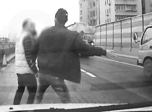 在郭先生轎車的行車記錄儀的錄像中,郭先生拿著手機(jī)站在車頭,另外兩名男子也跟了上來,雙方隨后發(fā)生言語沖突,其中一名身穿黑色外套的男子更是動手拍打郭先生的臉部,隨后,郭先生還被黑衣男子推打。