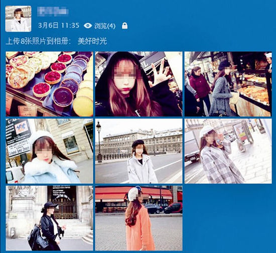 “最好找粉絲在10萬以下的網(wǎng)紅?!痹谖⒉┥希簭妺故斓厮训揭粋€名為“Panny”的模特,點擊其關(guān)注的好友,找到類似幾名網(wǎng)紅,讓記者下載她們的照片,用修圖軟件清除圖片上的水印,再上傳到QQ空間。魏強在QQ上假扮的“白富美”網(wǎng)名叫“Eiffel”,他還煞費苦心地更新“Eiffel”的QQ空間。