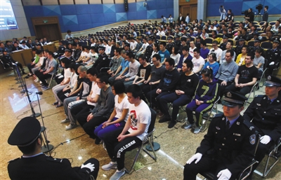 因為被告人太多,法院最大的法庭也無法容納。開庭前法院已將最大法庭前4排旁聽席的座位拆下,以擴大審判區(qū)的面積,同時從兄弟法院協(xié)調(diào)了法警30人,出動了12輛警車接送被告人。