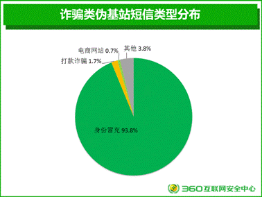 安全人員對(duì)詐騙類偽基站短信內(nèi)容進(jìn)行篩選和分析發(fā)現(xiàn),身份冒充類偽基站短信占到了絕大部分,占比為93.8%,打款詐騙(1.7%)、電商網(wǎng)站(0.7%)位列其后。