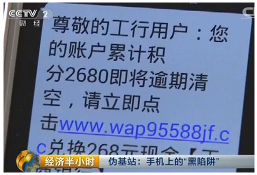 近日央視報(bào)道了湖北警方破獲的一系列短信詐騙案件。案件中,犯罪嫌疑人利用偽基站不定向向群眾發(fā)送冒充銀行的詐騙短信,通過(guò)發(fā)送有關(guān)積分兌換的信息騙取受害人的支付驗(yàn)證碼,轉(zhuǎn)走受害人銀行卡內(nèi)的5000元錢。安全專家提醒,偽基站欺詐短信猖獗,已成近幾年對(duì)用戶財(cái)產(chǎn)危害最大的欺詐類型,用戶需注意防范。