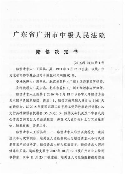 2013年,廣州中院啟動(dòng)再審程序并作出判決,撤銷前面的終審裁定和越秀區(qū)法院一審判決中的量刑部分,但維持了一審法院定罪部分,以非法買賣、運(yùn)輸槍支罪,改判王國其有期徒刑4年。由于低于法定刑期,判決需報(bào)請廣東高院與最高法核準(zhǔn)后生效。