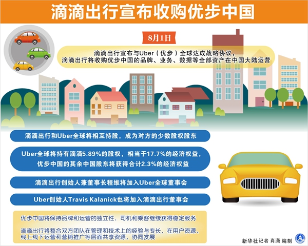 1日,滴滴出行宣布與Uber全球達(dá)成戰(zhàn)略協(xié)議,滴滴出行將收購(gòu)優(yōu)步中國(guó)的品牌、業(yè)務(wù)、數(shù)據(jù)等全部資產(chǎn),在中國(guó)大陸運(yùn)營(yíng)。