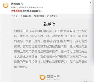 29日晚間,滴滴出行在其官方微博中發(fā)布了“給劉翔先生的致歉信”,承認未經(jīng)同意使用劉翔相關照片用于推廣,已造成侵權。新京報記者了解到,另一家涉及侵權的公司極路由也已向劉翔公開致歉。