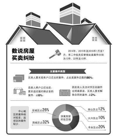 雖然房子賣了,但是賣家卻遲遲不遷走戶口;買了學(xué)區(qū)房因無法落戶導(dǎo)致孩子上學(xué)成了泡影……昨天,市二中院召開房屋買賣合同糾紛案件發(fā)布會,調(diào)研顯示,買房人要求現(xiàn)有戶口遷出案件占房屋買賣合同糾紛總數(shù)的86%,因戶口遷移引發(fā)的此類案件近年呈增長趨勢。市二中院表示,根據(jù)現(xiàn)行法律和政策,警方和法院都無法強(qiáng)迫原房主遷移戶口。