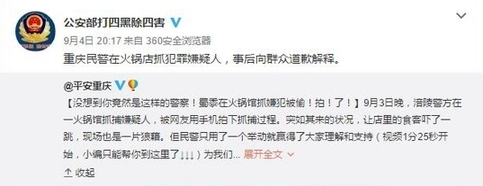 事后,有媒體了解到這名道歉者是來自重慶市涪陵區(qū)公安局荔枝派出所的一名民警。據他介紹,當時是正在對一名長期吸販毒的犯罪嫌疑人實施抓捕。由于嫌疑人吸食毒品精神亢奮且隨身攜有刀具,抓捕過程比較激烈,不少店內客人都起身圍觀,有些還拿出手機拍攝。抓捕結束后,帶隊民警第一時間找來餐館老板,亮明身份后表示警方會妥善處理餐館損失,并且特意向店內顧客道歉,于是就有了視頻中顯示的畫面。