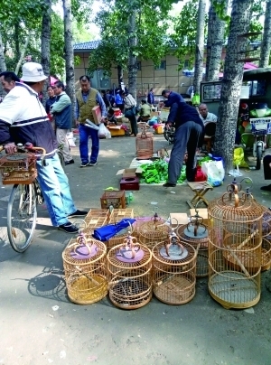 昨天上午,記者來(lái)到北沙灘橋附近,看到臨時(shí)集市藏身于一片楊樹(shù)林里,并被高高的圍墻圍了起來(lái)。樹(shù)林里賣(mài)鴿子的、賣(mài)小鳥(niǎo)的、賣(mài)魚(yú)的、賣(mài)蟲(chóng)的、賣(mài)古玩的攤子應(yīng)有盡有。其中,售賣(mài)小鳥(niǎo)的攤子有五六個(gè),有的把鳥(niǎo)籠直接掛在樹(shù)上,有的則在地上鋪開(kāi)來(lái),幾十只鳥(niǎo)籠排成一排(如圖)。據(jù)了解,有護(hù)鳥(niǎo)志愿者在上周末拍到的圖片中,幾百只鳥(niǎo)兒被關(guān)在籠里售賣(mài)。