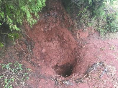 順著吳大爺?shù)闹敢?,記者穿過一片蘆葦?shù)兀麠l山路雜草叢生,無路可尋。在山頂?shù)囊豢冒貥湎?,記者找到了尸體被埋處,一個約半米深、寬半米的泥坑,樹根裸露在外,周圍新翻的泥土掩蓋了雜草?,F(xiàn)場還有警方取證時留下使用過的一次性手套。