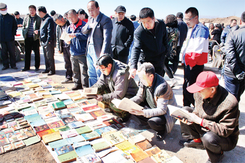 3月14日,原平市文化路集貿(mào)市場圖書飄香,市民們正在挑選自己喜愛的書籍。該市著力打造文化強市,處處彰顯文化氛圍。(趙春曉 攝)