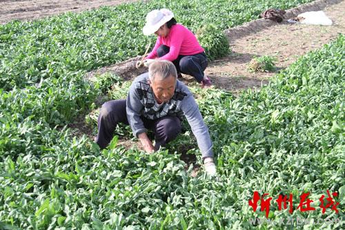 4月7日,原平市南灘村綠油油的菜地里,一對(duì)夫妻正在揮鐮收菠菜,準(zhǔn)備銷往市場(chǎng)。該市在落實(shí)各項(xiàng)惠農(nóng)政策的同時(shí),積極推進(jìn)農(nóng)業(yè)結(jié)構(gòu)調(diào)整,將簡(jiǎn)單粗放型農(nóng)業(yè)向精細(xì)高效型農(nóng)業(yè)提升,使農(nóng)民收入成倍翻番,真正讓農(nóng)民嘗到了甜口。(褚震 攝)
