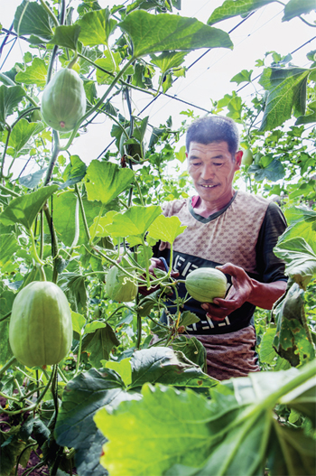 5 月14 日,忻府區(qū)部落村民在自家溫室大棚采摘甜瓜。他家種植溫室大棚甜瓜六七年了,今年采用了立體式種植甜瓜技術(shù),達到了甜瓜早上市、采摘時間長的目的,成了當(dāng)?shù)胤N植甜瓜的技術(shù)帶頭人。(曹建國 攝)