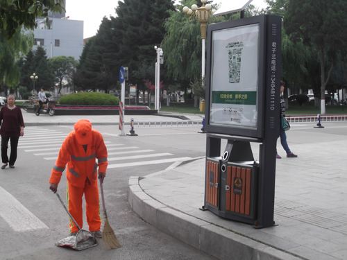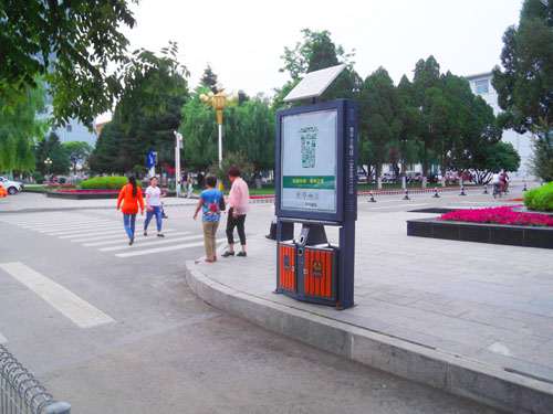 6月4日太陽(yáng)能果皮箱亮相原平市街道兩旁。該市引進(jìn)的新型太陽(yáng)能環(huán)保亮化分類果皮箱,帶有太陽(yáng)能發(fā)電,晚上自動(dòng)亮燈照明,方便垃圾處理、回收利用,受到群眾歡迎。(趙春曉 攝)