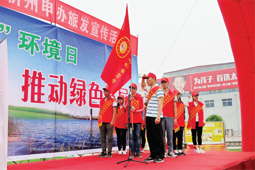 6 月5 日上午,第四十五個世界環(huán)境日宣傳活動在我市體育廣場舉行。圍繞“改善環(huán)境質(zhì)量,推動綠色發(fā)展”主題,市環(huán)保局開展了百人騎行、文藝演出、助力忻州旅游投票等活動。圖為我市環(huán)保志愿者協(xié)會志愿者代表正在宣誓。(王君 攝)