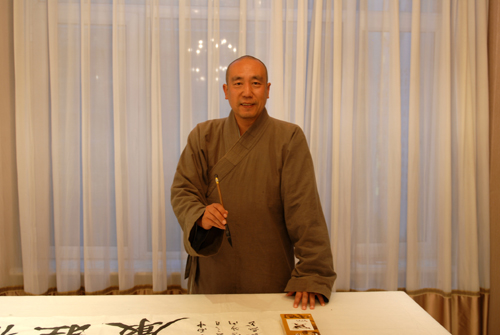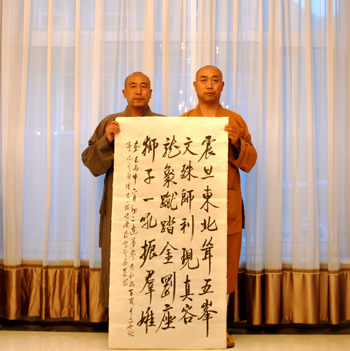 利用閑暇,筆者與行腳僧進(jìn)行了簡單溝通,了解到法師來自廣東省韶關(guān)云門山大覺禪寺,法名圣泰,是云門宗第十五代弟子,酷愛書法,且仰慕五臺山多時,此行特用且行且書的方式了卻多年朝圣心愿。