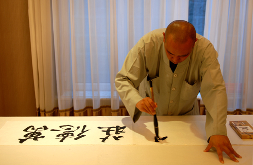 7月5日下午,筆者在五臺山金都山莊偶遇精彩一幕。只見數(shù)十人屏氣凝神,圍觀一行腳僧現(xiàn)場揮毫潑墨。行云流水之際,一幅幅書法作品躍然紙上。