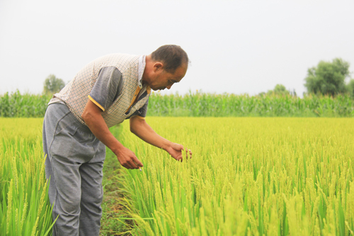 8月13日,原平市大庫(kù)狄村民王財(cái)旺正在稻田里查看長(zhǎng)勢(shì)。山西省原平市大庫(kù)狄村依傍滹沱河不缺水的優(yōu)勢(shì),發(fā)展水稻特色種植,生產(chǎn)的優(yōu)質(zhì)大米成為品牌,商家客戶上門收購(gòu),富了村民。預(yù)計(jì)今年畝產(chǎn)可達(dá)到千斤。(吉建平 攝)