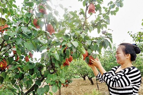 走進(jìn)梨園,記者看到,一排排梨樹枝粗葉茂,大大小小的套袋酥梨掛滿了枝頭,等待著人們的采摘?!耙郧熬褪敲考矣心敲磶卓脴?,零零散散不成氣候?,F(xiàn)在形成了規(guī)?;N植,在市場上也打出了品牌?!蓖跫t麗指了指周邊一眼看不到盡頭的梨園,介紹說這都是同村的村民種植的。為了符合人們現(xiàn)在純天然、綠色、無污染的消費(fèi)需求,所有的梨在剛成形時就被套上了袋子,不再打農(nóng)藥?!艾F(xiàn)在各家各戶都開始采摘了,再過幾天,就會有各地來的經(jīng)銷商統(tǒng)一收購。”