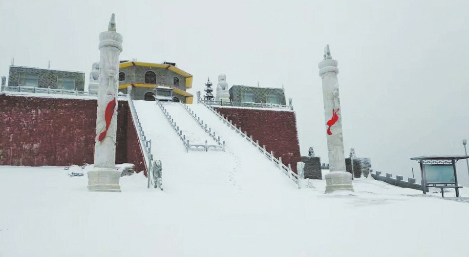 此次降雪主要分布在五臺山平均海拔2800米以上的五座臺頂。因為臺頂與臺懷腹地海拔相差1000米以上,所以時有“臺懷飄雨臺頂雪”的奇觀出現(xiàn)。東臺頂亦名望海峰,《清涼山志》載:“蒸云寢壑,爽氣澄秋,東望明霞,若陂若境,即大海也。亦見滄瀛諸州,因以為名?!蓖7迨俏迮_山觀日出的絕佳位置。7日一大早,東方不見明霞,整個東臺頂銀裝素裹,霧靄茫茫,天籟梵音依舊,在圣潔的佛國仙境踏雪而行,更深切地感受人生一步一個腳印的意義。(本報記者 馬卓超 通訊員 覺一 攝影報道)
