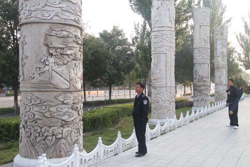 10月9日,原平市民在范亭文體廣場聚落的柱式雕塑前觀看愛國名將續(xù)范亭、東晉名士郝隆等16位名人紀(jì)念雕像。近年來,該市著力打造文化強(qiáng)市,利用柱式雕塑像繪制歷史文化名人、抗日英雄等群體形象,營造濃濃的文化氛圍。(褚震 攝)