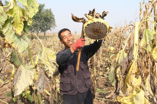 10月13日,原平市解村鄉(xiāng)圪坨村林同種植專業(yè)合作社正在收獲向日葵,該社引進(jìn)三瑞公司種植1000余畝SH363向日葵喜獲豐收。近年來,該市積極引導(dǎo)農(nóng)民調(diào)整農(nóng)業(yè)產(chǎn)業(yè)結(jié)構(gòu),采取“合作社+農(nóng)戶”的模式,向日葵比玉米收入高四倍,銷售價(jià)每斤4塊左右,合作社為農(nóng)戶提供種子、種植技術(shù)等服務(wù),帶動(dòng)當(dāng)?shù)厝罕娫鍪罩赂弧?span style="font-family: 楷體,楷體_gb2312, simkai">圖為解村鄉(xiāng)村民趁著秋高氣爽的晴好天氣,在田間地頭葵花籽的情景。(褚震 攝)
