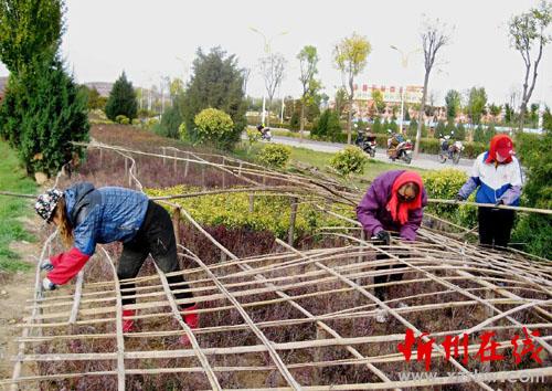 入冬以來(lái),隨著氣溫逐漸下降,我市各地的綠籬植物紛紛住進(jìn)了“防寒屋”。圖為河曲縣濱河濕地公園正組織員工,用竹竿、竹片為綠籬植物搭建拱棚骨架,保障不耐寒的綠植順利越冬。(賈金理 攝)