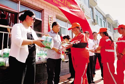 領到粽子的環(huán)衛(wèi)工人們高興不已,市容五所的環(huán)衛(wèi)工人白新云告訴記者:“我覺得很開心,一來過節(jié)有了愛心粽子吃;二來企業(yè)送粽子給環(huán)衛(wèi)工人,是對我們工作的體諒和支持,說明大家看到了我們的付出。現(xiàn)在環(huán)衛(wèi)工作得到越來越多人的關注,大家齊心協(xié)力為城市的整潔而努力,我們的家園一定會越來越美麗?!毕聢D為工作人員為環(huán)衛(wèi)工人分發(fā)粽子小禮盒(實習記者 許凈)