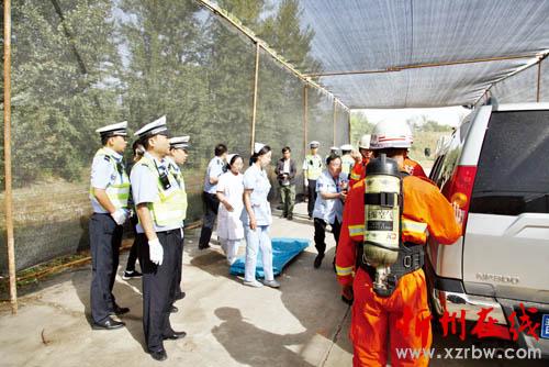 演練假設當日上午10時10分在S206南屯隧道入口處,一輛小型汽車與一輛?;愤\輸車追尾,此次交通事故造成兩人死亡、1人受傷,汽油泄露,隨時有爆炸的危險……110指揮中心接到群眾報警后,立即下達事故救援指令,并通知“120”醫(yī)療急救中心、“119”消防大隊,同時將事故情況向交警大隊進行了匯報,請示該市道路交通安全委員會啟動重特大交通事故應急救援預案。民警趕赴事故現(xiàn)場后,各項救援工作有條不紊進行?,F(xiàn)場救援組立即展開受傷人員救護等工作,協(xié)助醫(yī)療隊伍做好傷員救治及傷員轉(zhuǎn)送工作;現(xiàn)場勘查組著手開展了現(xiàn)場勘查、調(diào)查取證等工作;外圍警戒組對現(xiàn)場中心路段進行交通管制,在不同路段堵截分流無關車輛、人員;善后處理組拖移事故車輛、移送尸體、對事故現(xiàn)場進行了清理。
