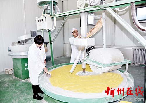 代縣南北兩半坡所產的小米,由于地理環(huán)境特殊,無霜期長,光照充足,晝夜溫差大,不僅色澤金黃品質優(yōu),而且口感好,久負盛名,十分走俏。該公司用石碾加工小米,以散裝每公斤14元、高檔包裝每公斤16元出售,銷往北京、太原等地。圖為公司員工用石碾加工小米(石俊文 劉睿)