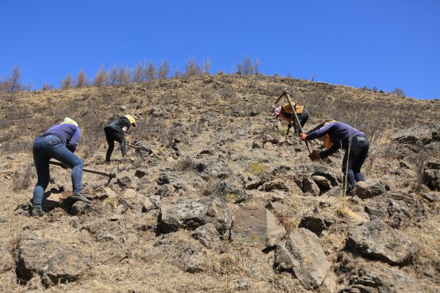 塞罕壩機(jī)械林場(chǎng)工人在石質(zhì)陽(yáng)坡上造林(2016年4月13日攝)。新華社發(fā)