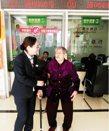 城區(qū)利民街西口郵政儲(chǔ)蓄銀行員工熱情為客戶服務(wù),受到群眾好評(píng)。圖為該行客服經(jīng)理微笑攙扶、護(hù)送八旬老客戶辦理完業(yè)務(wù)后離開(kāi)大廳。王金龍 攝