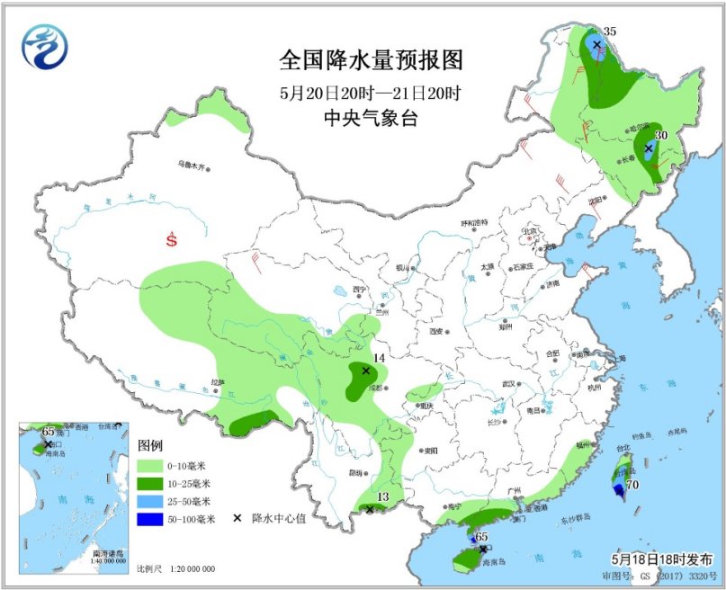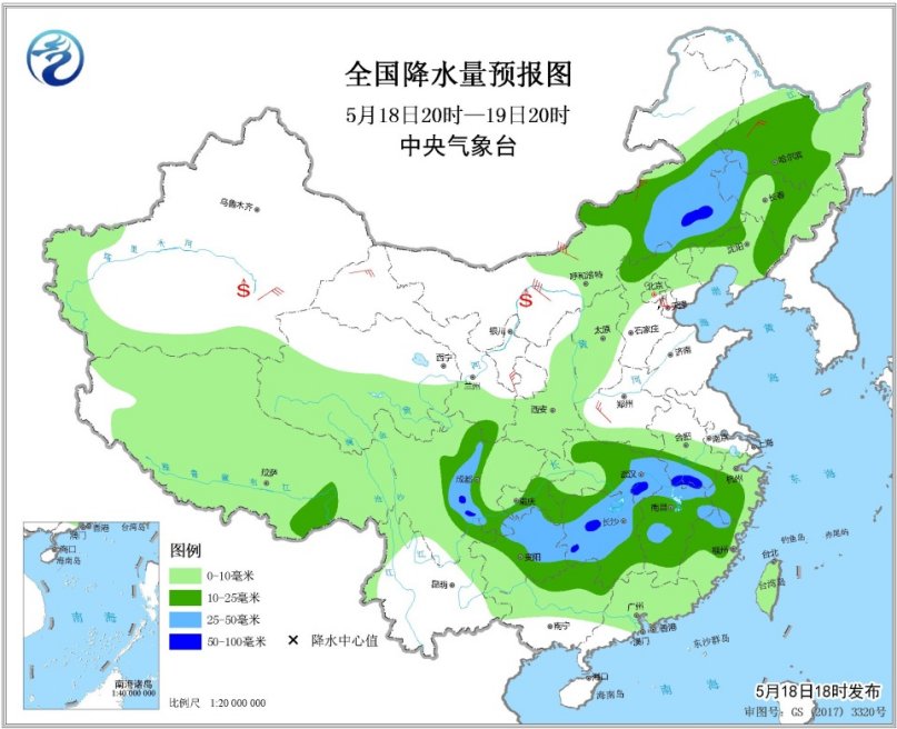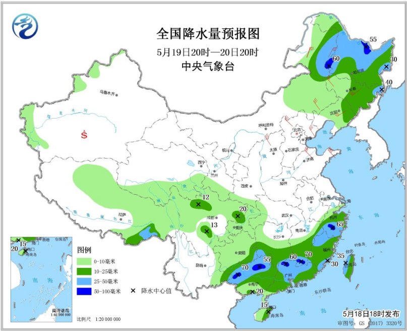 5月19日20時至20日20時,內(nèi)蒙古東北部、東北地區(qū)中北部、江南南部和東部、華南大部等地的部分地區(qū)有中到大雨,局地有暴雨(50~70毫米)。內(nèi)蒙古中東部、華北、黃淮、東北地區(qū)中南部等地的部分地區(qū)有4~6級風(fēng),陣風(fēng)7~8級。南疆盆地等地局地有揚沙或浮塵。渤海西南部海域?qū)⒂?~8級、陣風(fēng)9~10級的西北風(fēng)。