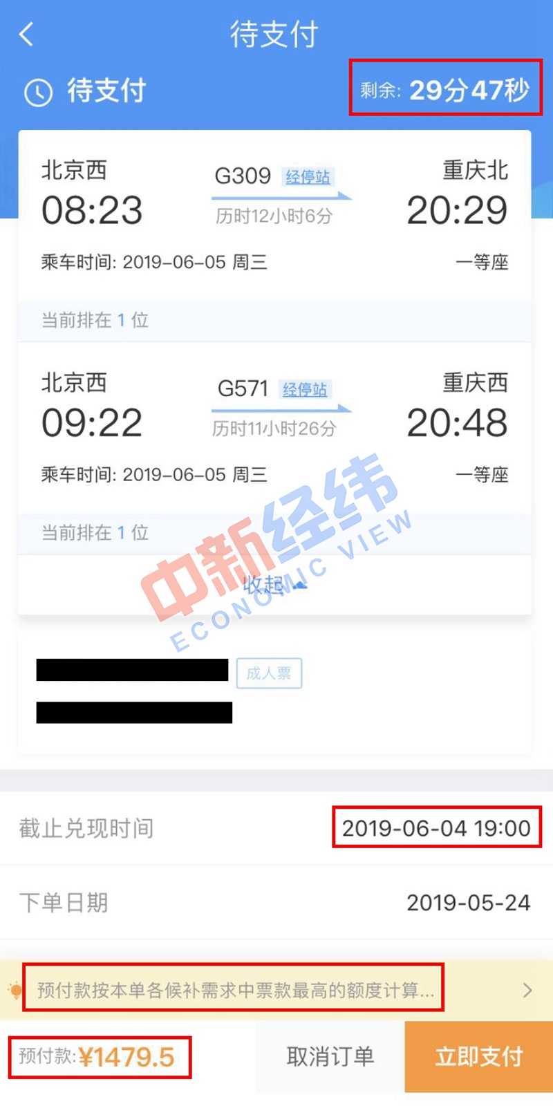 5、支付候補(bǔ)訂單。值得注意的是,候補(bǔ)訂單的支付需要在30分鐘內(nèi)完成,預(yù)付款按本單各候補(bǔ)需求中票款最高的額度計(jì)算。如果候補(bǔ)成功(即在兌現(xiàn)時(shí)間前搶到車票),預(yù)付票款中多出的部分,將自動(dòng)退回差額給原賬戶;如果候補(bǔ)購票失敗(即在兌現(xiàn)時(shí)間前未搶到車票),預(yù)付款將全額退回。