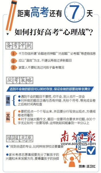 張敏強(qiáng)提醒,沖刺階段切勿盲目相信網(wǎng)上所謂的“內(nèi)部題”“必考題”,應(yīng)以“溫故”為主,不建議再做過多新題目。他提醒家長,考慮志愿填報(bào)要充分了解孩子的興趣和未來發(fā)展方向,要尊重孩子的抉擇,“找到合適的專業(yè),比純粹挑學(xué)校還要重要。”