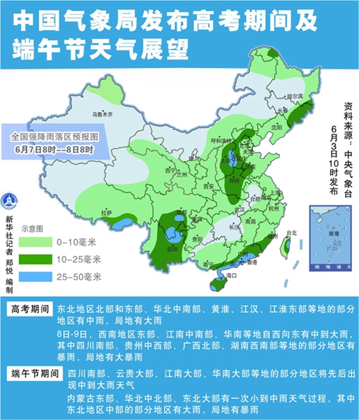 記者3日從中國氣象局6月新聞發(fā)布會上了解到,高考期間,東北地區(qū)北部和東部、華北中南部、黃淮、江漢、江淮東部等地的部分地區(qū)有中雨,局地有大雨;8日至9日,西南地區(qū)東部、江南中南部、華南等地自西向東有中到大雨,其中四川南部、貴州中西部、廣西北部、湖南西南部等地的部分地區(qū)有暴雨,局地有大暴雨。上述部分地區(qū)還將伴有短時強降水、雷暴大風(fēng)等強對流天氣,需要做好相應(yīng)防范。