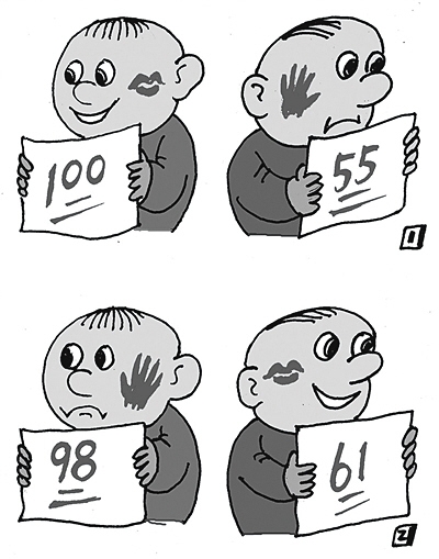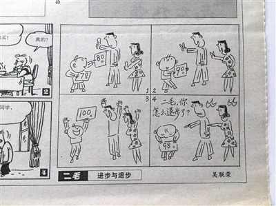 一個(gè)孩子考了100分,受到表?yè)P(yáng)。后來(lái)考了98分,結(jié)果被打了耳光;另一孩子考了55分,被打了耳光。第二次考了61分,卻受到表?yè)P(yáng):這幅名為《進(jìn)步與退步》的四格漫畫,入選為2016年高考全國(guó)卷1的作文題目。